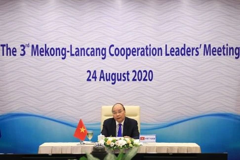 Thủ tướng Việt Nam Nguyễn Xuân Phúc phát biểu trước các nhà lãnh đạo các nước Lancang-Mekong trong hội nghị thượng đỉnh hôm 24-8. Ảnh: AFP