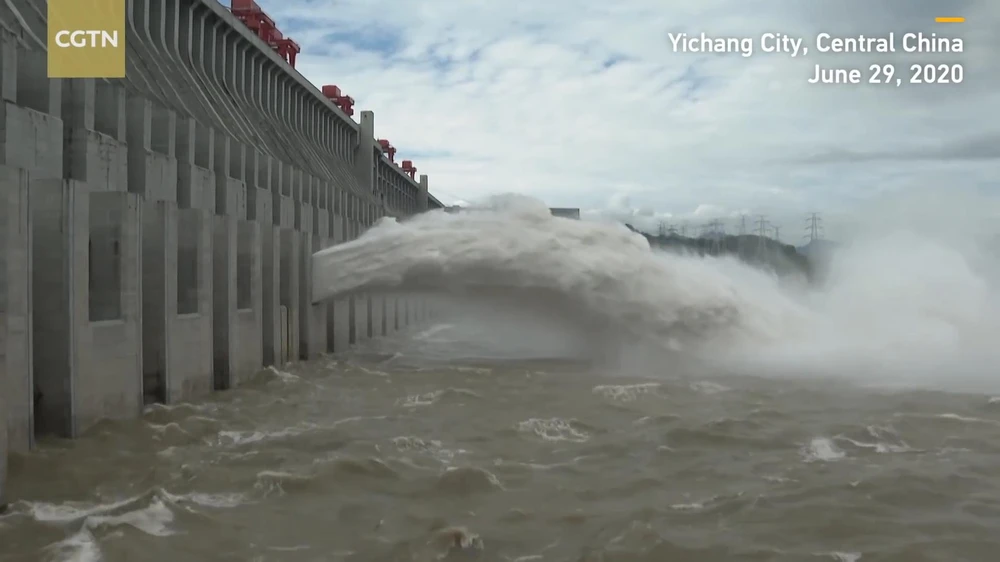 Đập Tam Hiệp mở hai cửa xả lũ từ sáng 29-6. Ảnh chụp màn hình CGTN