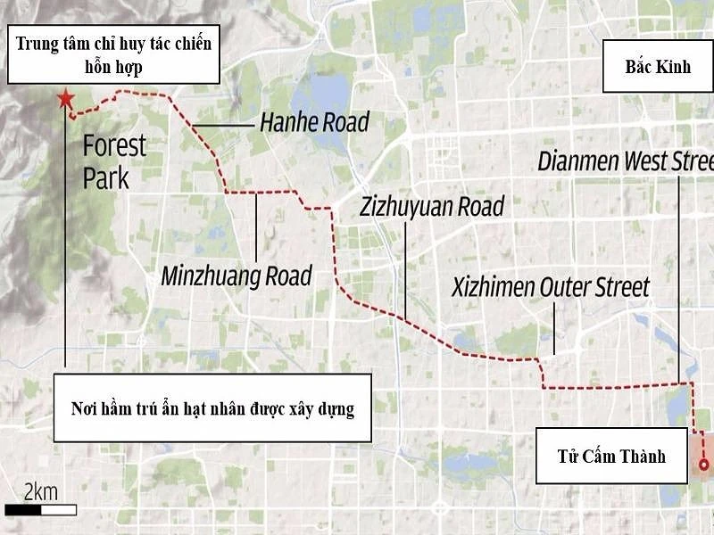 Hầm trú ẩn hạt nhân cách trụ sở chính quyền trung ương Trung Quốc chỉ khoảng 20 km. Đồ họa: SCMP