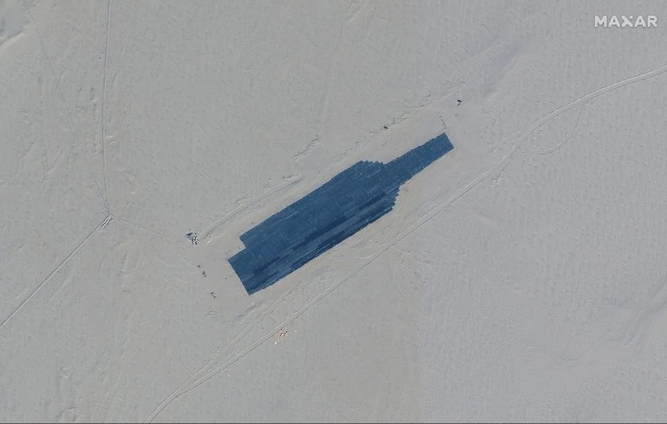 Mô hình tàu sân bay tại sa mạc Tân Cương của Trung Quốc do hãng Maxar chụp được. Ảnh: REUTERS
