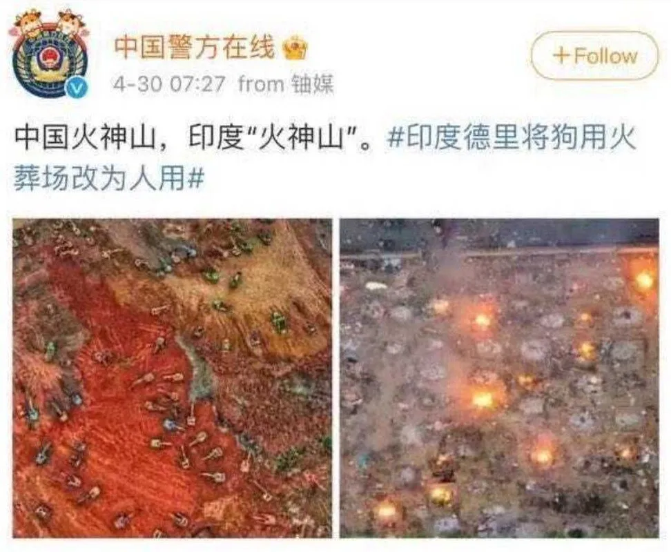 Trước đó, vào ngày 30-4, tài khoản chính thức của Bộ Công an Trung Quốc cũng đăng một ảnh khác, so sánh Houshenshan (hỏa thần sơn) - một bệnh dã chiến chống COVID-19 ở Vũ Hán, Trung Quốc - với các lò hỏa táng ở Ấn Độ.
