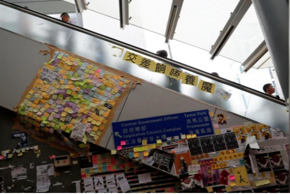 Những áp phích và giấy ghi chú được dán ở thang cuốn ủng hộ các cuộc biểu tình chống chính quyền Hong Kong. Ảnh: REUTERS