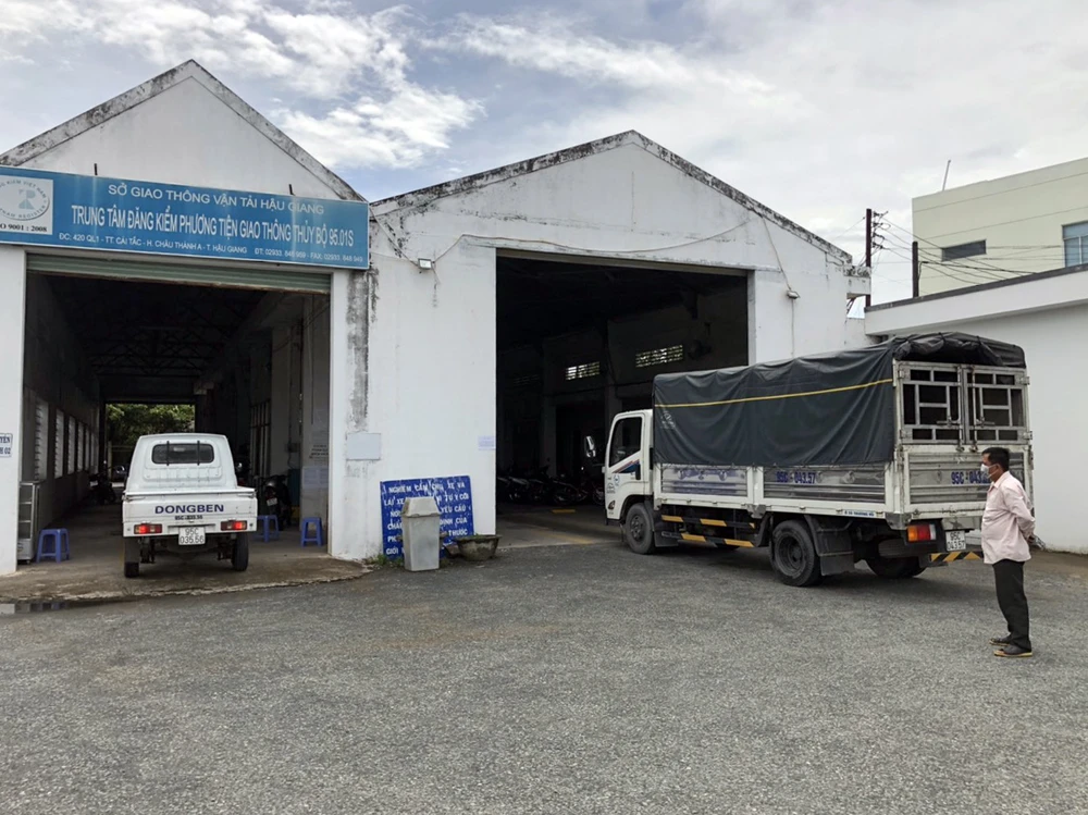Trong thời gian thực hiện giãn các xã hội, trung tâm đăng kiểm Hậu Giang vẫn hoạt động bình thường, đăng kiểm cho mọi phương tiện. Ảnh: NK