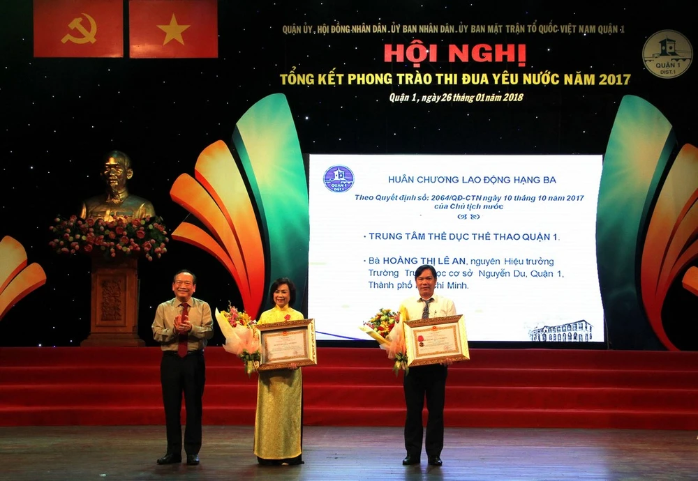 Ông Nguyễn Tấn Lợi - Phó Giám đốc Trung tâm TDTT quận 1 đại diện nhận huân chương Lao động hạng Ba. Ảnh: CCT
