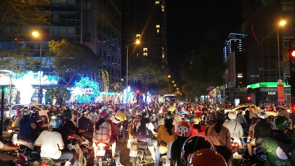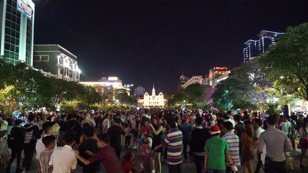 Phố đi bộ Nguyễn Huệ cũng đông nghẹt người đi chơi lễ Giáng sinh. Ảnh: QUỐC VŨ