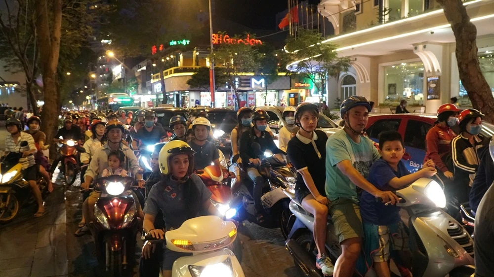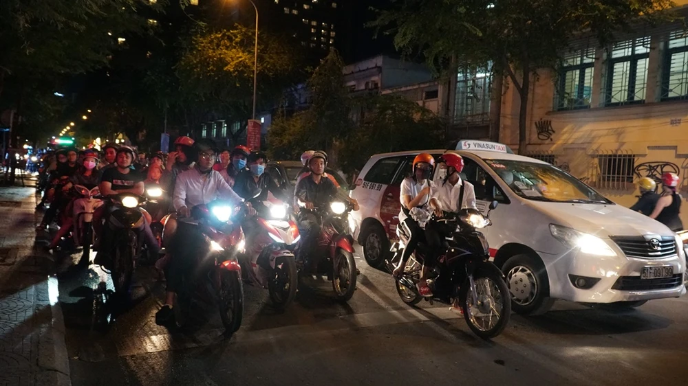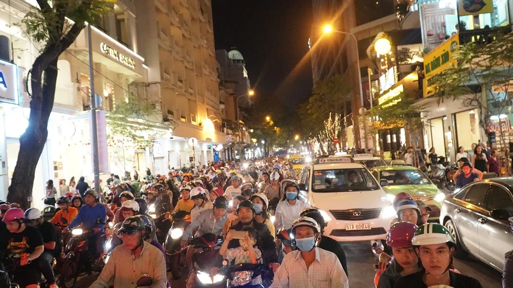 Đường Tôn Đức Thắng (quận 1) cũng kẹt cứng vì lượng người đổ xuống đường quá lớn. Ảnh: QUỐC VŨ