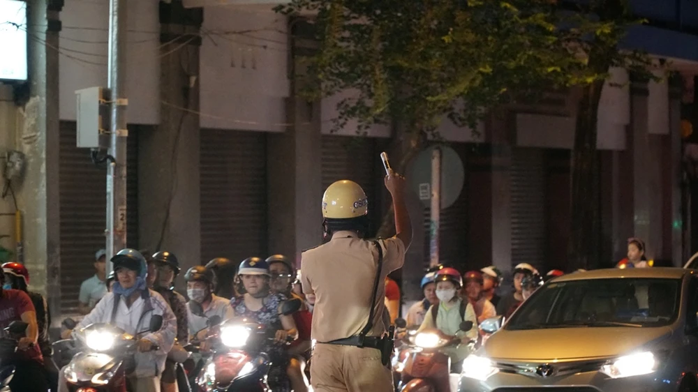 Lực lượng CSGT rất vất vả trong việc điều tiết giao thông. Ảnh: QUỐC VŨ