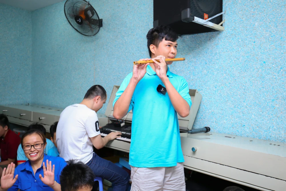 Nguyễn Văn Báu hào hứng thổi sáo hòa tấu bài "Trên đường chiến thắng" dành tặng cho Sài Gòn FC...