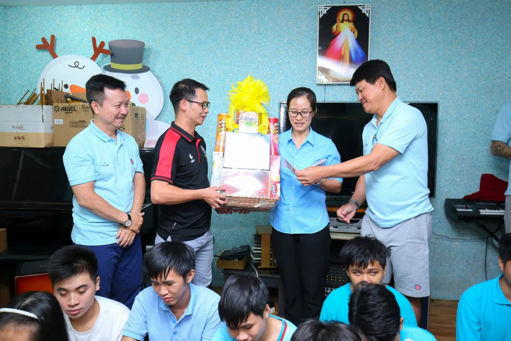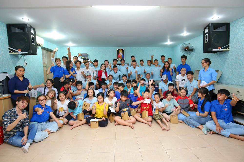 Các thành viên Sài Gòn FC và Đoàn trường Đại học Văn Lang giao lưu với các em nhỏ ở mái ấm Thiên Ân.