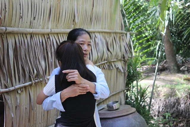 Hai mẹ con chị Lượm mừng tủi khi được xác nhận trúng thưởng. Ảnh nghệ sĩ cung cấp