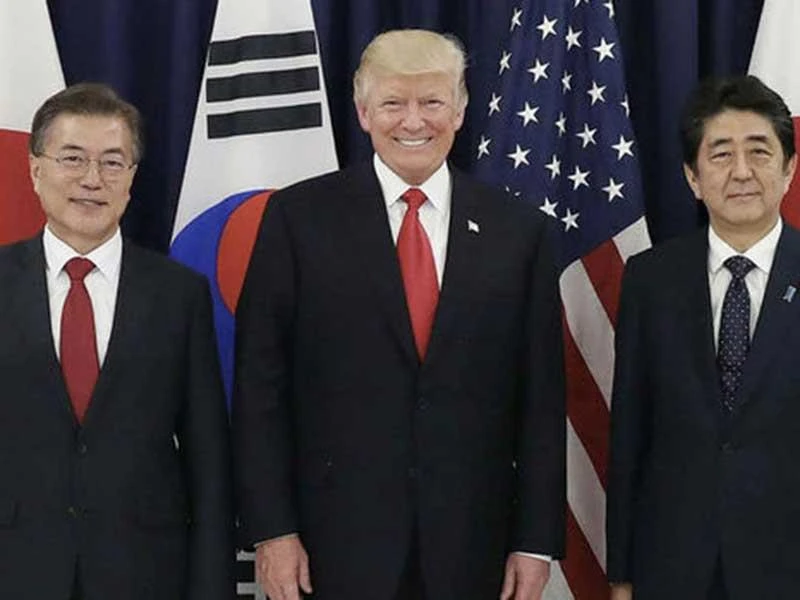 Từ trái sang: Tổng thống Hàn Quốc Moon Jae-in, Tổng thống Mỹ Donald Trump và Thủ tướng Nhật Shinzo Abe. Ảnh: GETTY IMAGE