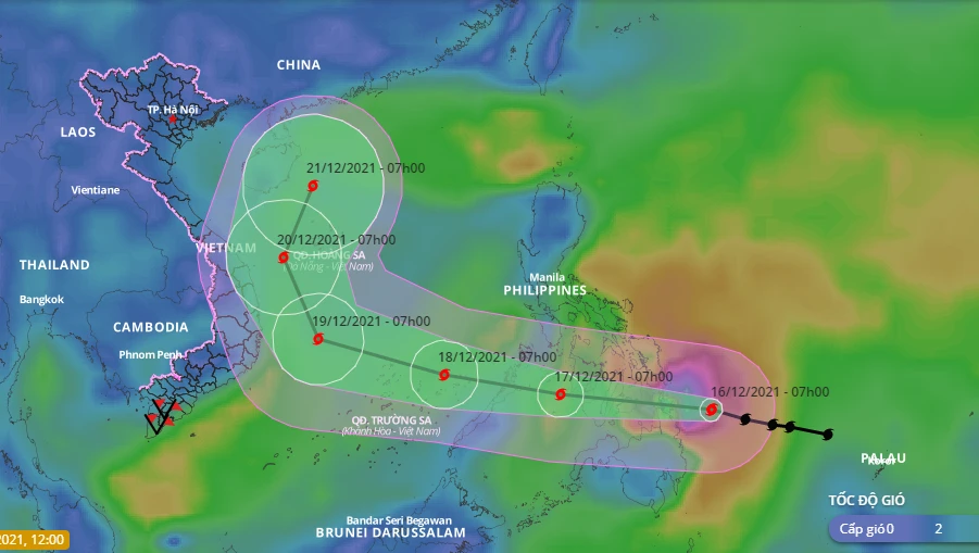 Dự báo đến đêm 17-12, bão RAI sẽ đi vào Biển Đông trở thành cơn bão số 9 năm 2021. Sau khi vào Biển Đông, bão RAI duy trì cấp 12-13, giật cấp 16. Đáng lưu ý, khi vào sát bờ bão có thể đổi hướng.