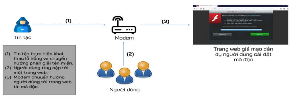 Mô hình tấn công khai thác lỗ hổng bảo mật trên các thiết bị định tuyến (router). Ảnh: BCA