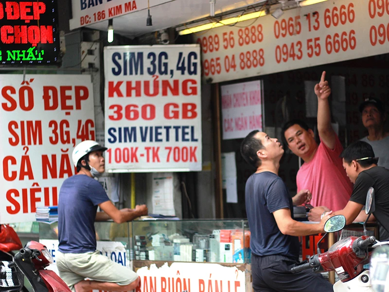 Giá SIM 11 số đẹp đã tăng hàng chục lần so với thời điểm chưa có thông tin rút SIM 11 số về 10 số. Trong ảnh: Giao dịch tại một đại lý trước giờ G. Ảnh: VIẾT THỊNH