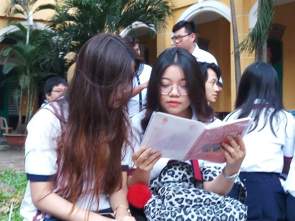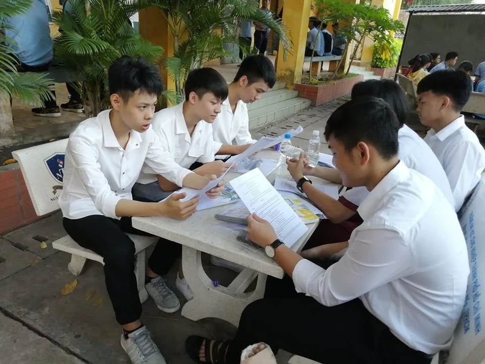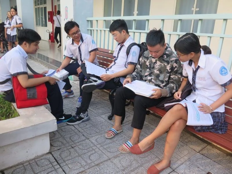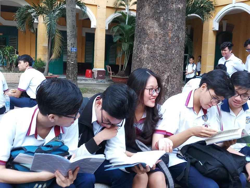 Tranh thủ ôn bài trước khi vào phòng thi tại điểm thi trường THPT Nguyễn Huệ, quận 9, TP.HCM