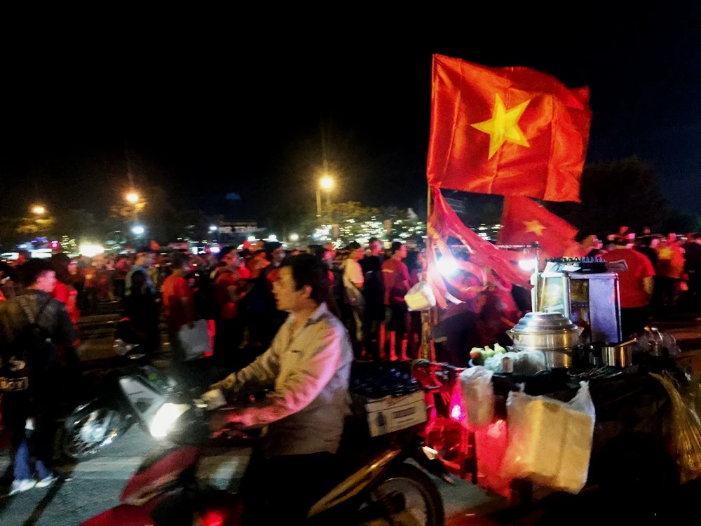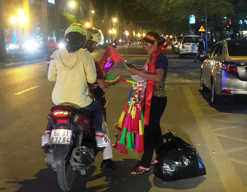 Cờ Tổ quốc, còi và các dải băng có dòng chữ cổ vũ đội tuyển được bày bán ngay từ đầu đường hướng về sân Mỹ Đình.
