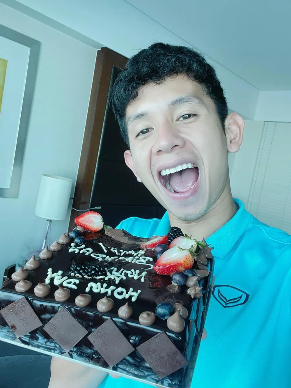 Hồng Duy khoe bánh sinh nhật trên đất UAE. ẢNH: HD
