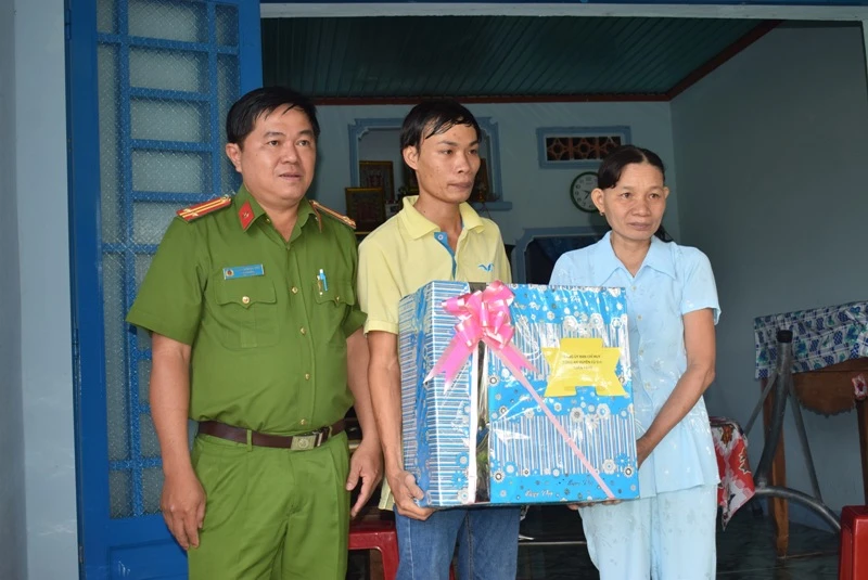 Trung tá Nguyễn Ngọc Anh - Đội trưởng đội ma túy Công an huyện Củ Chi trao quà cho gia đình.