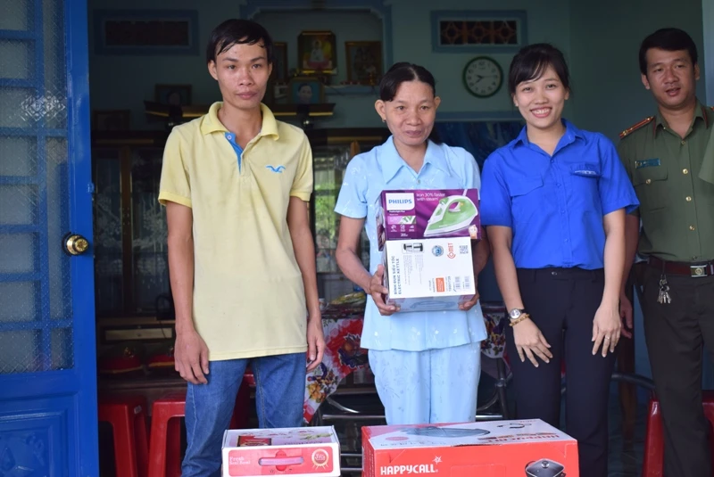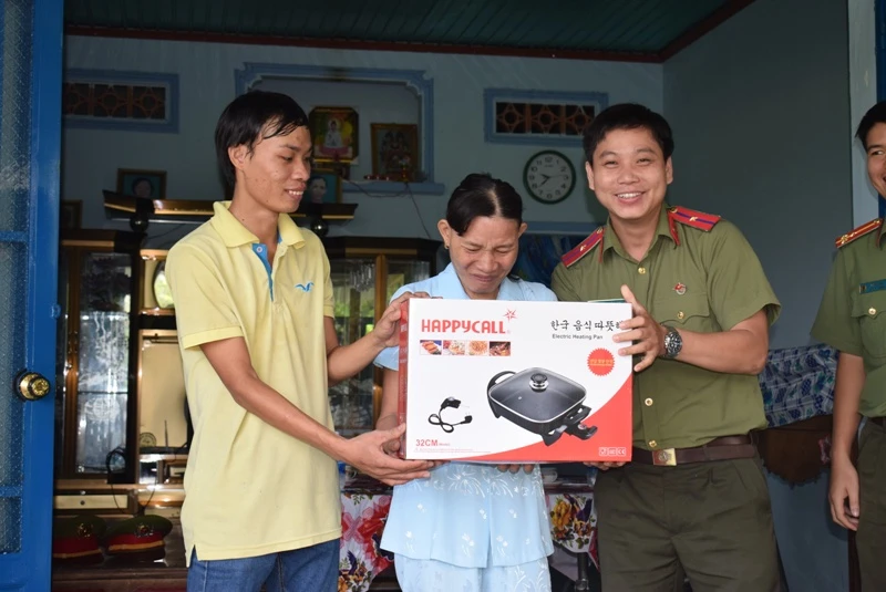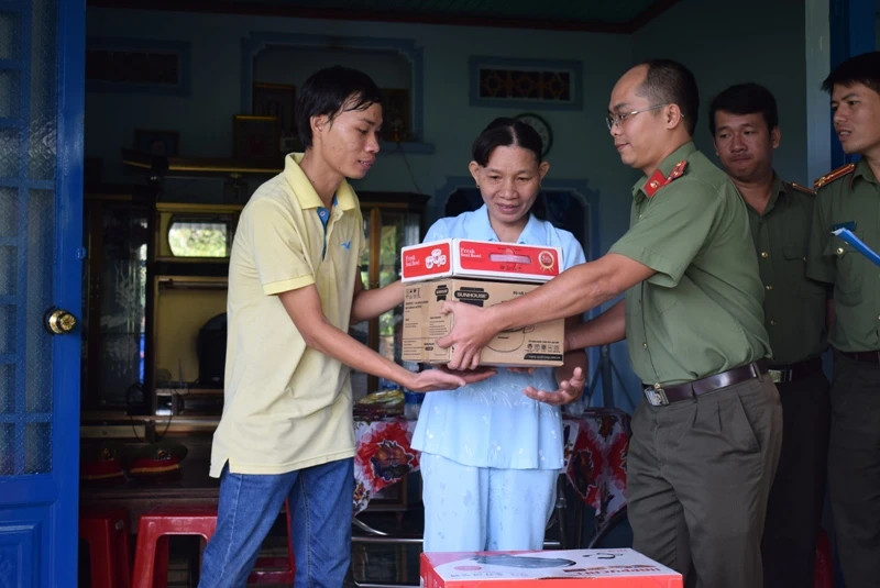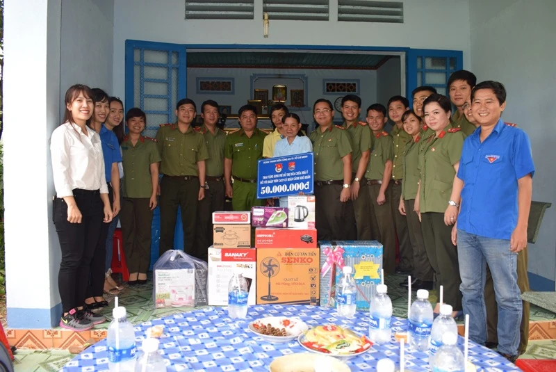 Ngoài 50 triệu hỗ trợ sửa nhà, Đoàn viên thanh niên Công an TP.HCM còn trao tận tay gia đình nhiều phần quà ý nghĩa là nhu yếu phẩm và đồ dùng nội thất giúp gia đình Thiếu úy Nghĩa có điều kiện sống tốt hơn.