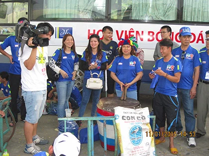 Các cổ động viên HA Gia Lai tập dượt cổ vũ ngay trước sân Long An.