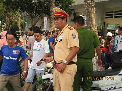 Cảnh sát giao thông vất vả điều phối giao thông quanh sân bóng.