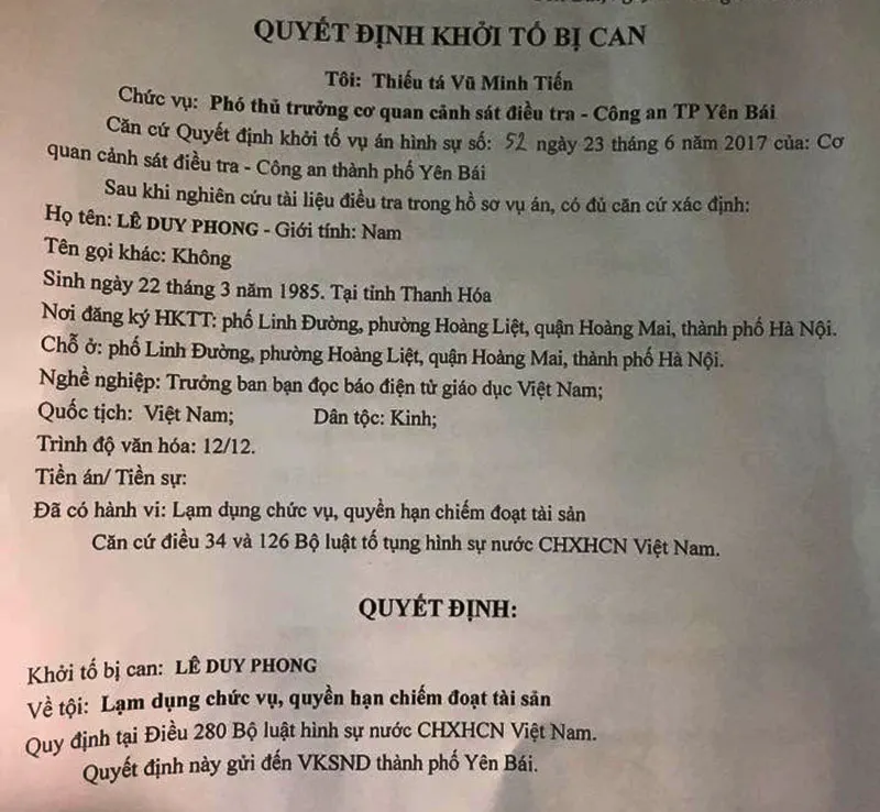 Liên quan vụ PV Lê Duy Phong (sinh năm 1985, quê Thanh Hóa), trưởng Ban Bạn đọc báo điện tử Giáo Dục Việt Nam (Giaoduc.net.vn), có hành vi nhận tiền của doanh nghiệp, ngày 26-6, Thượng tá Chu Văn Hải, Phó Trưởng phòng Tham mưu Công an tỉnh Yên Bái, cho biết đã khởi tố vụ án, khởi tố bị can với ông Phong về tội lạm dụng chức vụ, quyền hạn chiếm đoạt tài sản.