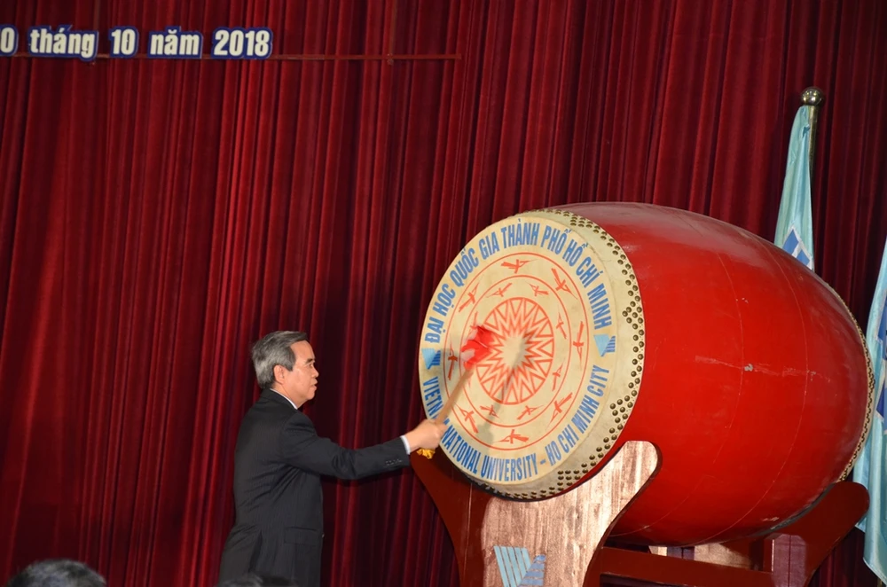 Ông Nguyễn Văn Bình đánh trống khai khóa tại ĐHQG TP.HCM. Ảnh: NGUYỄN QUYÊN