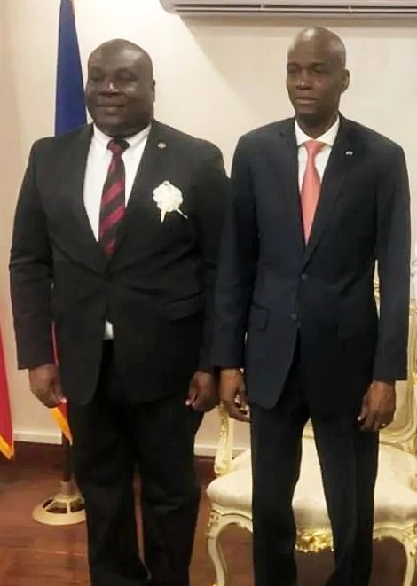 Trưởng bộ phận an ninh Jean Laguel Civil (trái) chụp hình cùng Tổng thống Moise (phải). Ảnh: HAITIAN TIMES