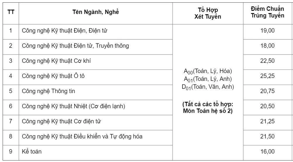 Theo đó, ngành công nghệ kỹ thuật ô tô có mức điểm chuẩn cao nhất: 25,25. Kế đến là ngành công nghệ kỹ thuật cơ khí với 22,5 điểm. Điểm này là điểm tổng theo tổ hợp A00, A01 và D01, trong đó môn toán nhân hệ số 2.