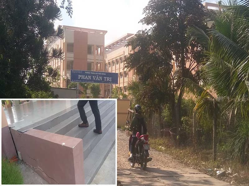 Trường THPT Phan Văn Trị mới đưa vào sử dụng khoảng một năm nay nhưng nhiều điểm trong trường đã có dấu hiệu xuống cấp, hành lang nứt nẻ nghiêm trọng, mặt sàn sụt lún, bong tróc.