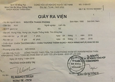 Cha của Phong, ông Nguyễn Vạn Năng, cho biết thêm khi Phong loạng choạng về tới nhà thì vùng mặt, vùng bụng, ngực bị tím bầm, máu tai chảy ra nhiều. Chưa kịp hỏi thì Phong ngất xỉu nên gia đình đưa vào BV Đa khoa Thống Nhất, Đồng Nai cấp cứu. Sau gần một tuần điều trị, Phong mới xuất viện. Trên giấy xuất viện ghi anh bị chấn thương vùng đầu, chấn thương thành bụng và rách màng nhĩ phải.