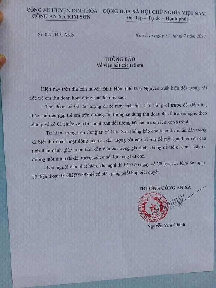 Tuy nhiên, theo Thiếu tá Hạc Sơn Linh - Phó Trưởng Công an huyện Định Hóa (Thái Nguyên), tin bắt cóc trẻ em chỉ là tin đồn. "Nhưng anh Nguyễn Văn Chinh, Trưởng Công an xã Kim Sơn không xác minh đã đưa thông tin đó vào trong văn bản gây hoang mang dư luận”- Thiếu tá Linh nói.