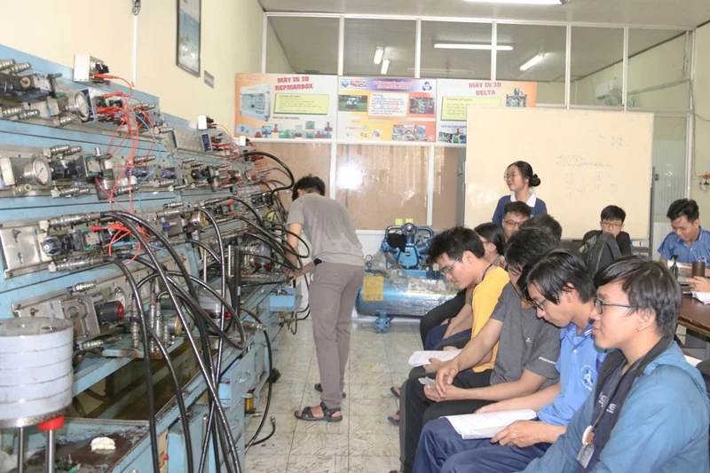Sinh viên Trường ĐH Bách khoa trong một giờ học tại xưởng.