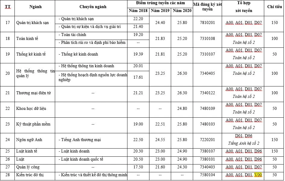 Trong đó, tại Cơ sở TP.HCM, nhiều ngành/chuyên ngành mới hoàn toàn như chuyên ngành Kiến trúc và thiết kế đô thị thông minh (thuộc ngành Kiến trúc đô thị), chuyên ngành Quản trị công nghệ và đổi mới sáng tạo (thuộc ngành Quản trị kinh doanh), chuyên ngành Quản trị tín dụng (thuộc ngành Tài chính - Ngân hàng).