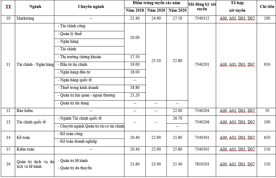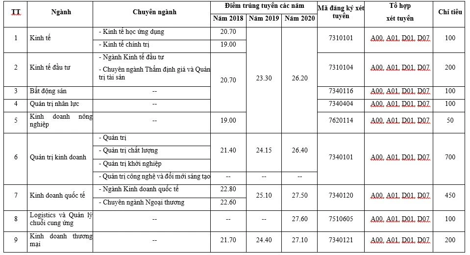 Thông tin tuyển sinh từng ngành như sau: