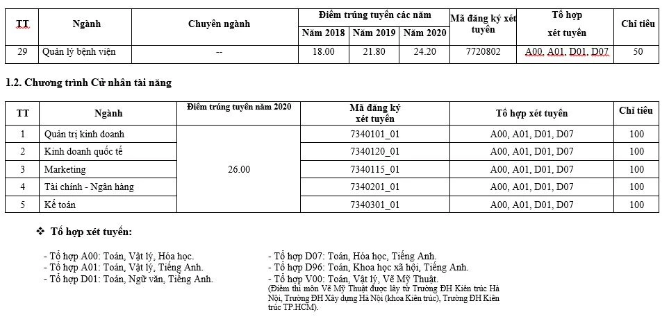 Như vậy, trường nâng tổng số lên sáu tổ hợp xét tuyển năm 2021. Riêng điểm thi môn Vẽ mỹ thuật sẽ được lấy từ Trường ĐH Kiến trúc Hà Nội, Trường ĐH Xây dựng Hà Nội (khoa Kiến trúc), Trường ĐH Kiến trúc TP.HCM).
