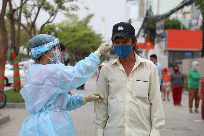 Mỗi người dân đến đều được đo thân nhiệt kiểm tra sức khỏe. ẢNH: NTCC