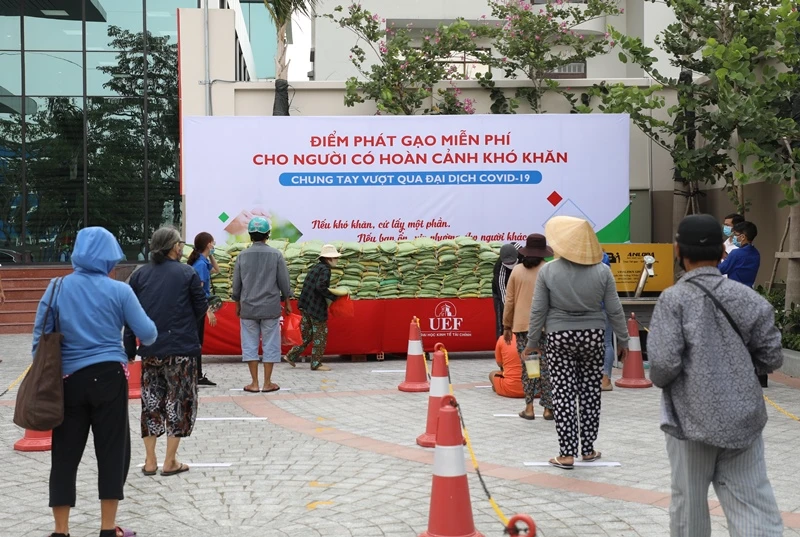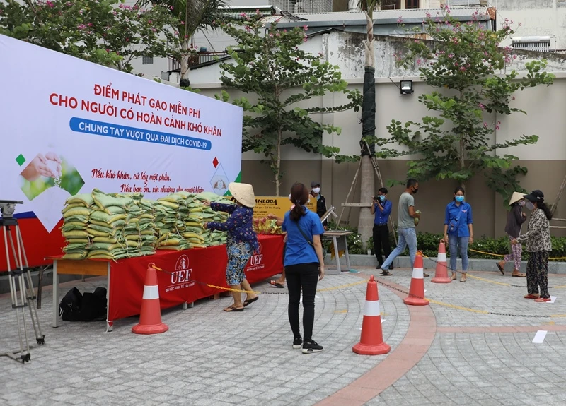 Từ 15 giờ đến 17 giờ hàng ngày, nhiều người dân khó khăn lại đến “ATM gạo” tại Trường ĐH Kinh tế - Tài chính TP.HCM (141-145 Điện Biên Phủ, phường 15, quận Bình Thạnh, TP.HCM) nhận gạo.