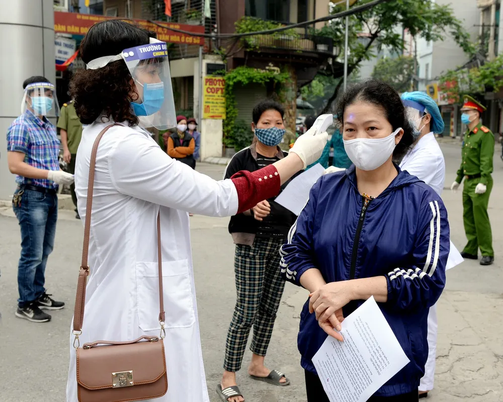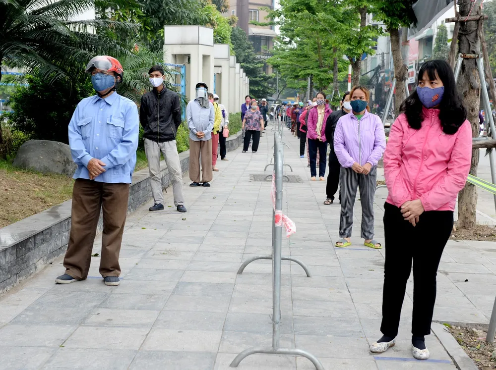 Mọi người tới không chỉ được nhận gạo mà còn được đội ngũ y bác sĩ của trường kiểm tra thân nhiệt, hướng dẫn cụ thể xếp hàng cách nhau tối thiểu 2 m để đảm bảo an toàn.
