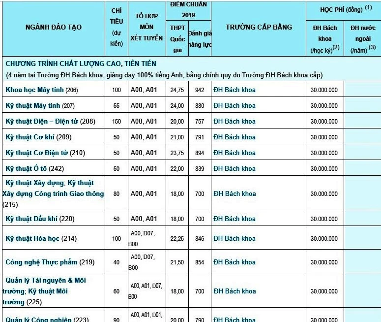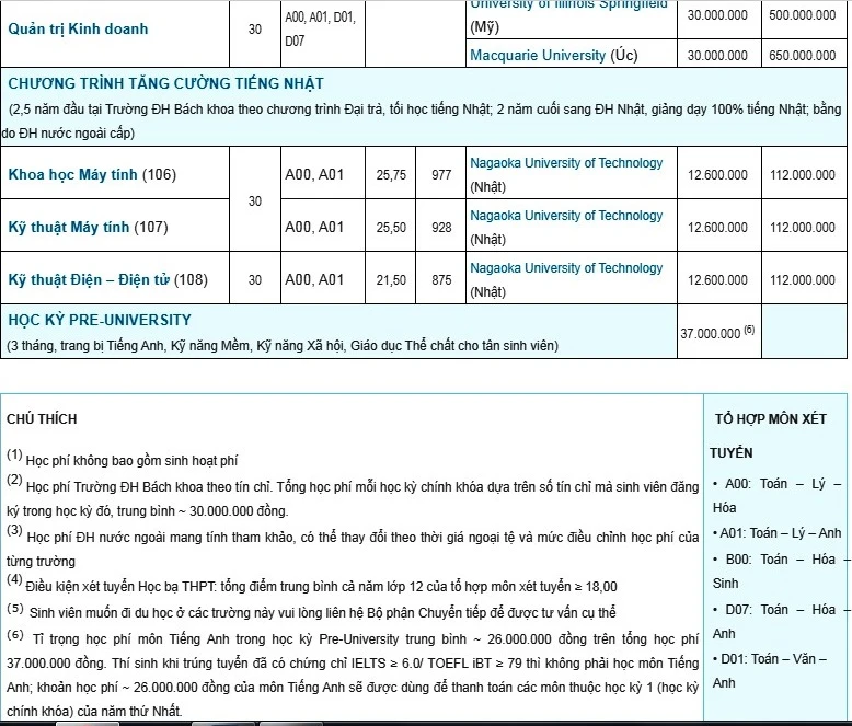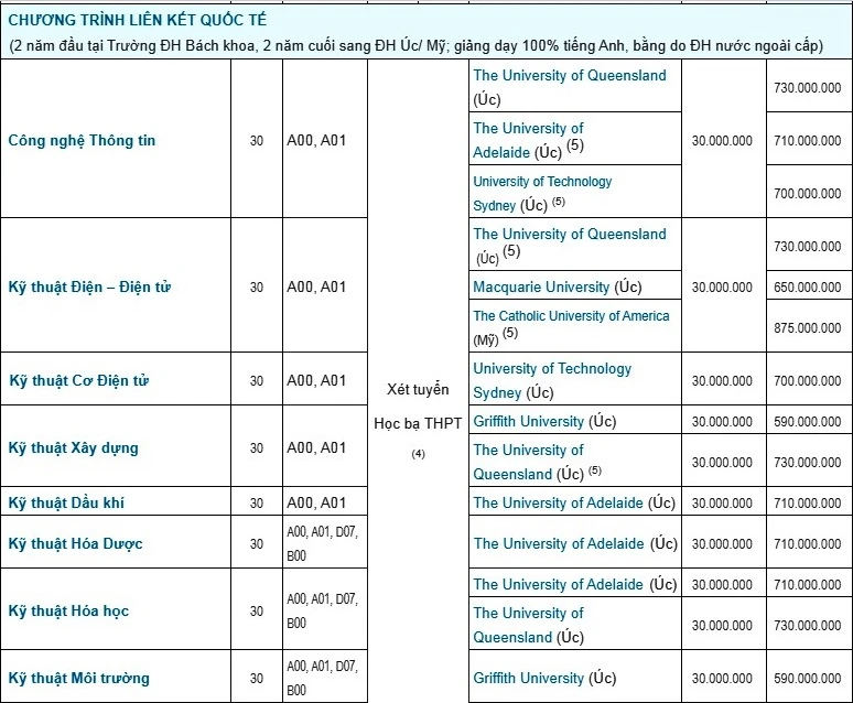 Nhà trường cho hay chỉ tiêu cho những ngành/ chương trình này là 45 sinh viên. Các em sẽ được giảng dạy hoàn toàn bằng tiếng Anh. Riêng chương trình chất lượng cao tiếng Nhật, giảng dạy bằng tiếng Việt và tăng cường tiếng Nhật.