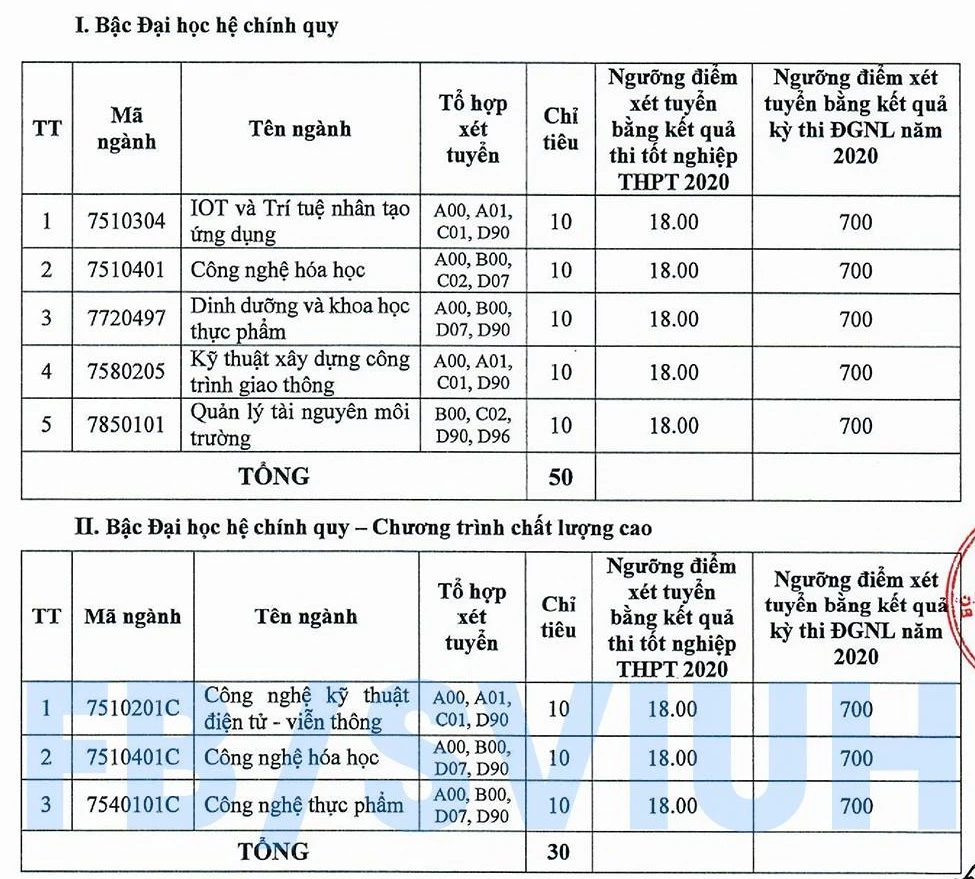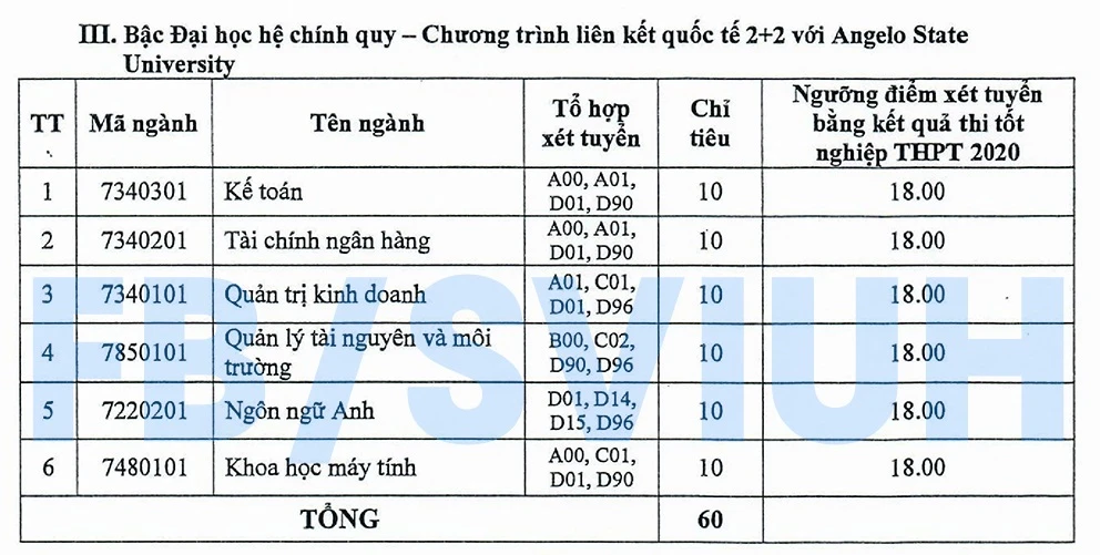 Trong đó, năm ngành đại học ở hệ chính quy đại trà với 50 chỉ tiêu, 30 chỉ tiêu cho ba ngành ở hệ chất lượng cao và 60 chỉ tiêu cho sáu ngành ở chương trình liên kết quốc tế 2+2.