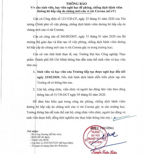 Chiều 11-2, Trường ĐH Công nghiệp thực phẩm TP.HCM đã có thông báo về việc tiếp tục cho sinh viên nghỉ học thêm một tuần, tức đến hết ngày 23-2, nhằm ứng phó với dịch bệnh viêm đường hô hấp cấp do chủng mới virus Corona (nCoV) gây ra.