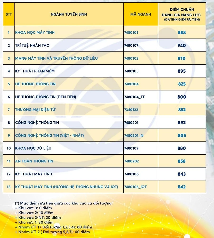 Theo đó, điểm chuẩn các ngành dao động từ 805 đến 940 điểm, theo thang điểm 1.200 của bài thi đánh giá năng lực. Trong đó, ngành Trí tuệ nhân tạo có mức điểm cao nhất với 940.