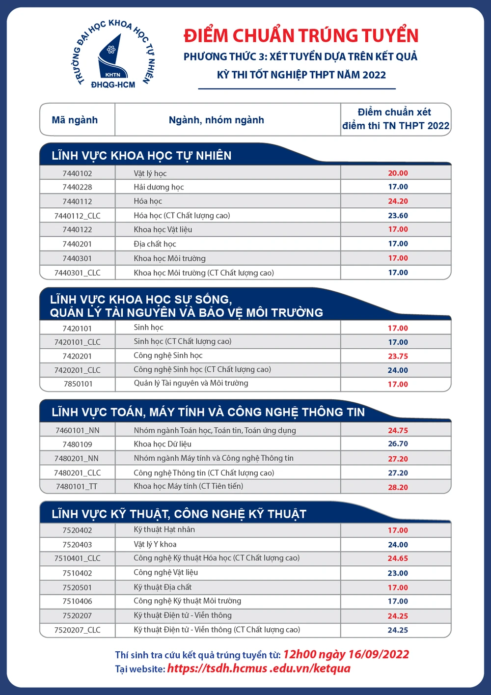 Chiều 15-9, Hội đồng Tuyển sinh Trường ĐH Khoa học Tự nhiên (ĐH Quốc gia TP.HCM) quyết định điểm chuẩn trúng tuyển theo phương thức dựa trên kết quả của Kỳ thi tốt nghiệp THPT 2022.