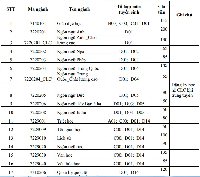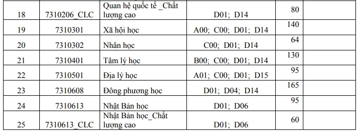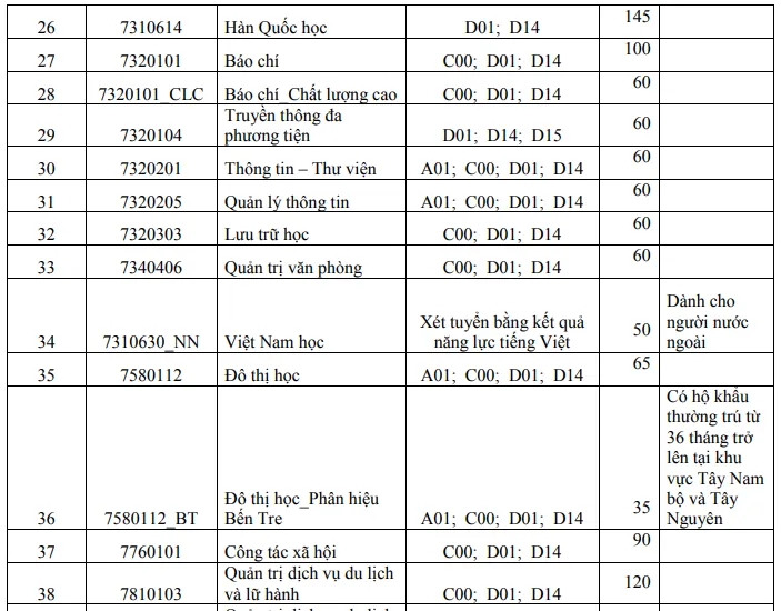 Thông tin tuyển sinh từng ngành như sau: