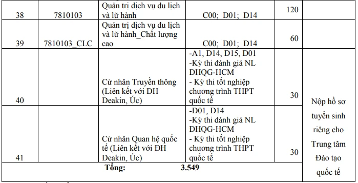 Theo đó, năm nay, trường này dự kiến sẽ tuyển 3.549 chỉ tiêu trình độ đại học chính quy cho 41 ngành đào tạo chương trình trong nước và chương trình liên kết quốc tế.