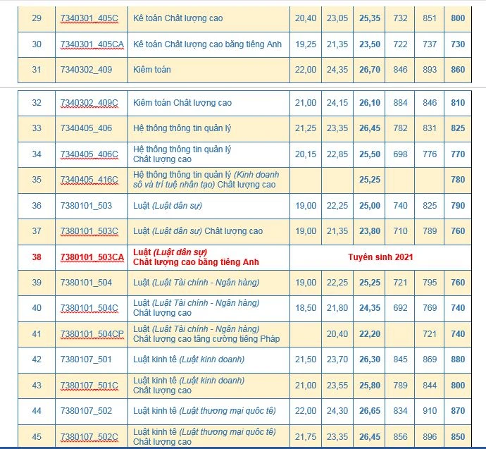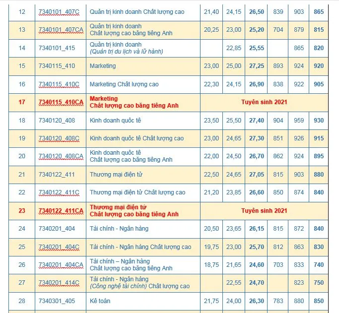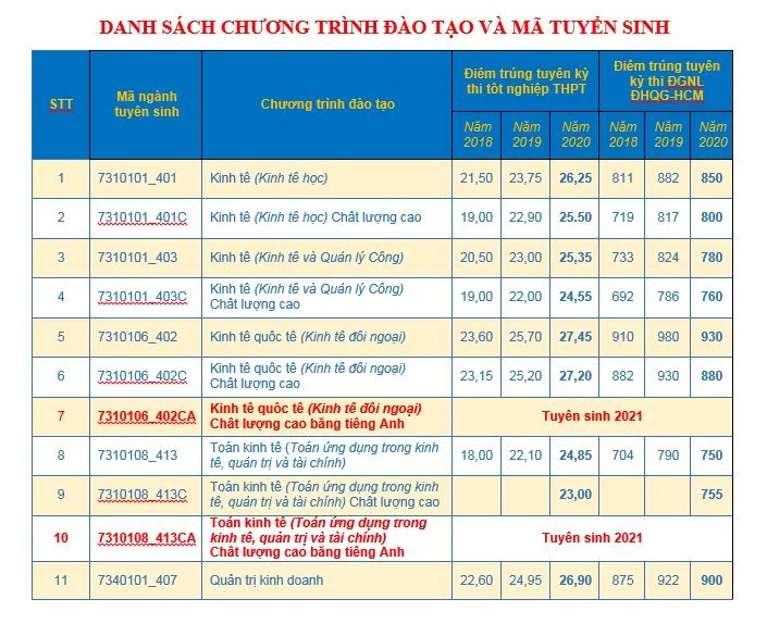 Năm nay trường cũng tuyển sinh dự kiến thêm 4 chương trình chất lượng cao bằng tiếng Anh là: Luật dân sự chất lượng cao bằng tiếng Anh (mã tuyển sinh: 7380101_503CA), Marketing chất lượng cao bằng tiếng Anh (mã tuyển sinh: 7340115_410CA), Toán kinh tế (ứng dụng trong kinh tế, quản trị và tài chính) chất lượng cao bằng tiếng Anh (mã tuyển sinh: 7310108_413CA), Kinh tế quốc tế chất lượng cao bằng tiếng Anh (mã tuyển sinh: 7310106_402CA) và Thương mại điện tử chất lượng cao bằng tiếng Anh (mã tuyển sinh: 7340122_411CA).