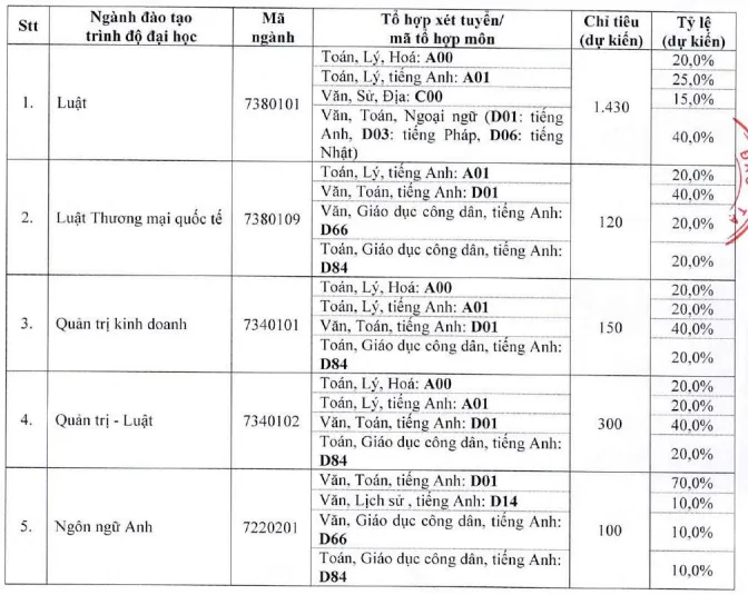 Theo đó, năm nay, trường dự kiến tuyển sinh 2.100 chỉ tiêu cho 5 ngành học. Trong đó, ngành chiếm đa số là Luật với 1.430 chỉ tiêu.