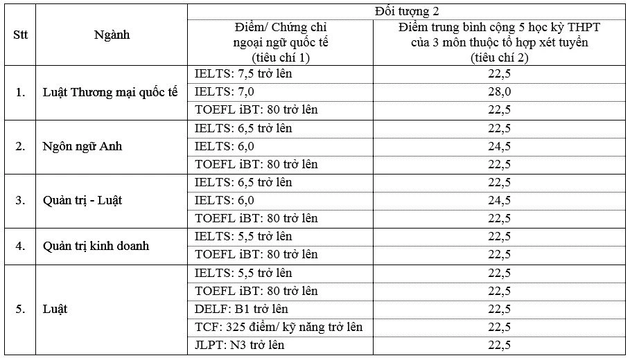 Đó là đối tượng thí sinh có chứng chỉ ngoại ngữ quốc tế còn thời hạn có giá trị, dự kiến đến ngày 30-6-2023 (nếu chứng chỉ có quy định về thời hạn). Thứ hai là đối tượng thí sinh học tại các trường THPT theo danh sách “các trường THPT thuộc diện được ưu tiên xét tuyển sớm năm 2023 của ĐH Quốc gia TP.HCM”.