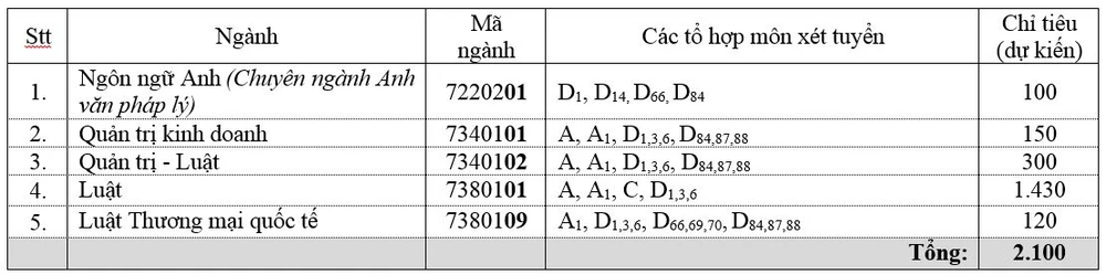 Theo Hội đồng tuyển sinh, trường dự kiến sẽ tuyển 2.100 chỉ tiêu cho năm ngành học, gồm: Ngôn ngữ Anh (chuyên ngành Anh văn pháp lý), Quản trị kinh doanh, Quản trị - luật, Luật và luật thương mại quốc tế.